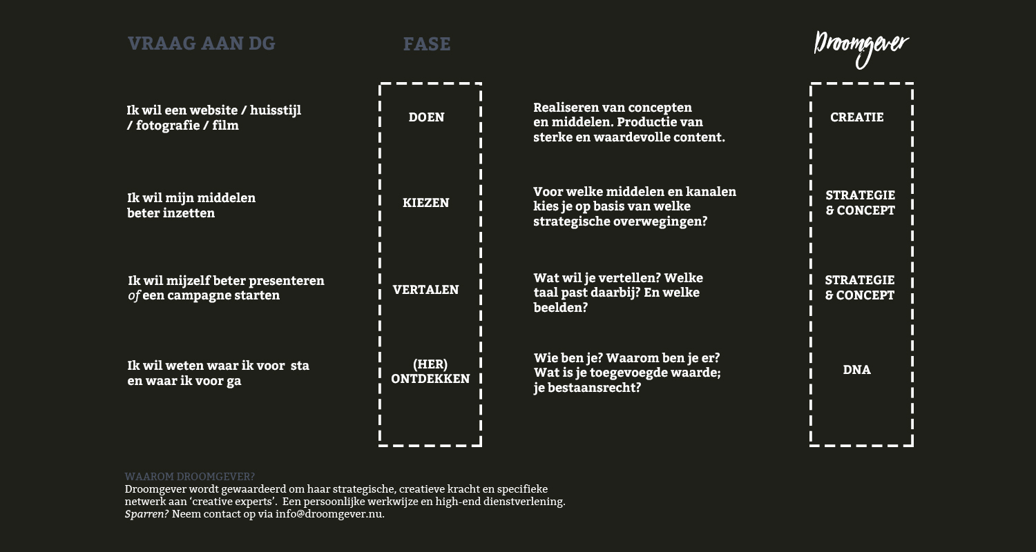 Droomgever is een schaalbare organisatie, bestaande uit (creatieve) specialisten aangevoerd door Reint Bergman, marketingspecialist pur sang met een grote liefde voor creatie. We werken van binnenuit, enkel uitvoeren is niet wat we doen. We willen dat plannen, ideeën en middelen daadwerkelijk iets toevoegen aan de dromen en ambities van organisaties. We doen ons best de opdrachtgever goed te leren kennen – om de droomhelder op tafel te krijgen en de journeyvanuit marketing/communicatie oogpunt inzichtelijk te maken. Vanuit daar werken we door naar realisatie. Wanneer we in dit proces als Droomgever invoegen kan per opdracht verschillen. Wat we altijd beogen is beweging, impact en resultaat. Grofweg bestaan opdrachten uit 4 grote stappen: